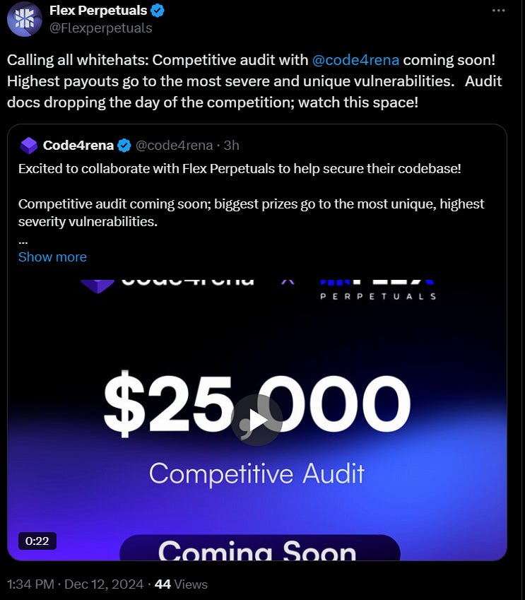 Flex Perpetuals will be working with Code4Arena & hosting a white hat audit.